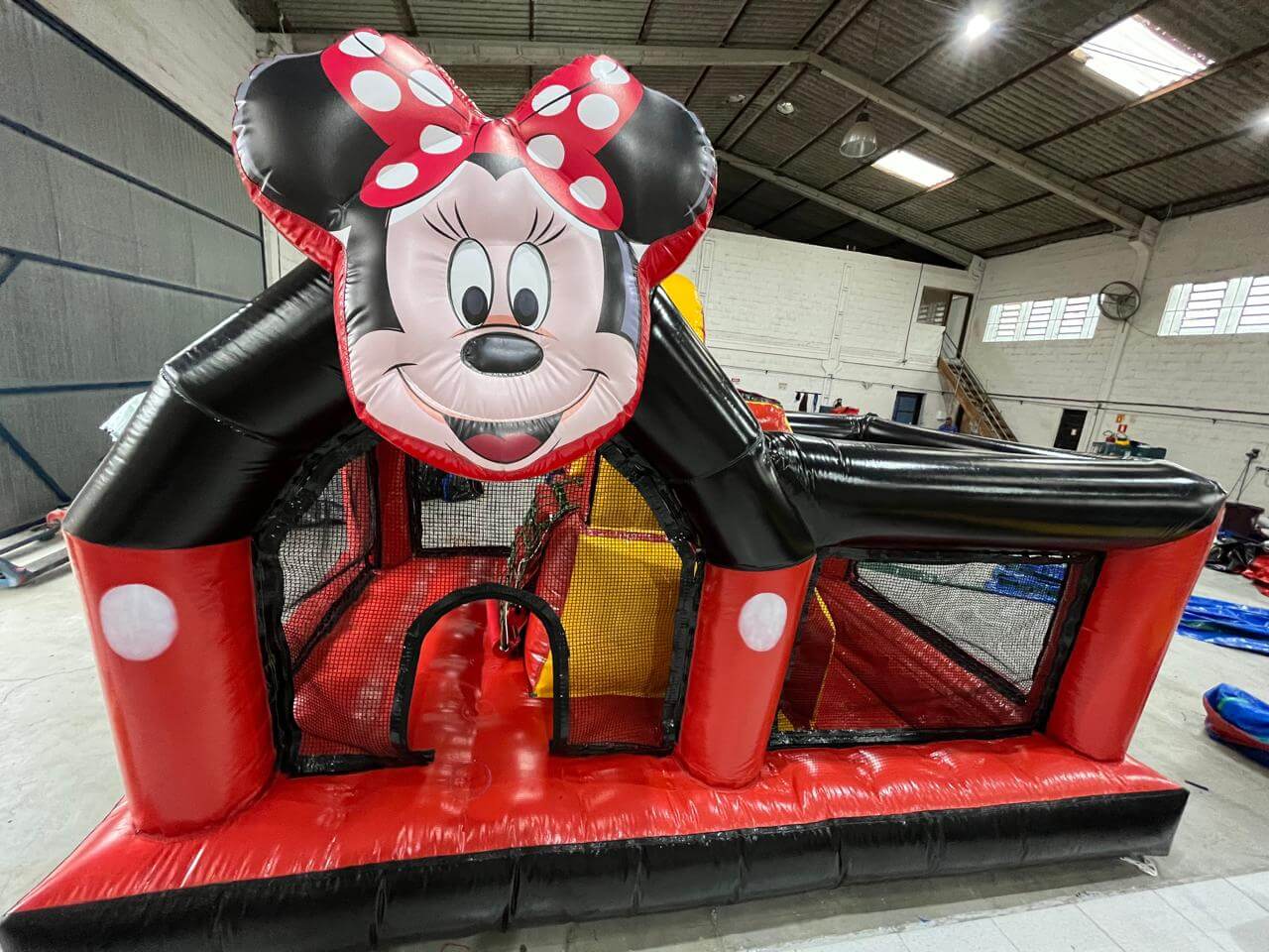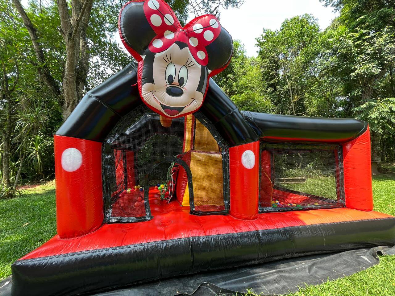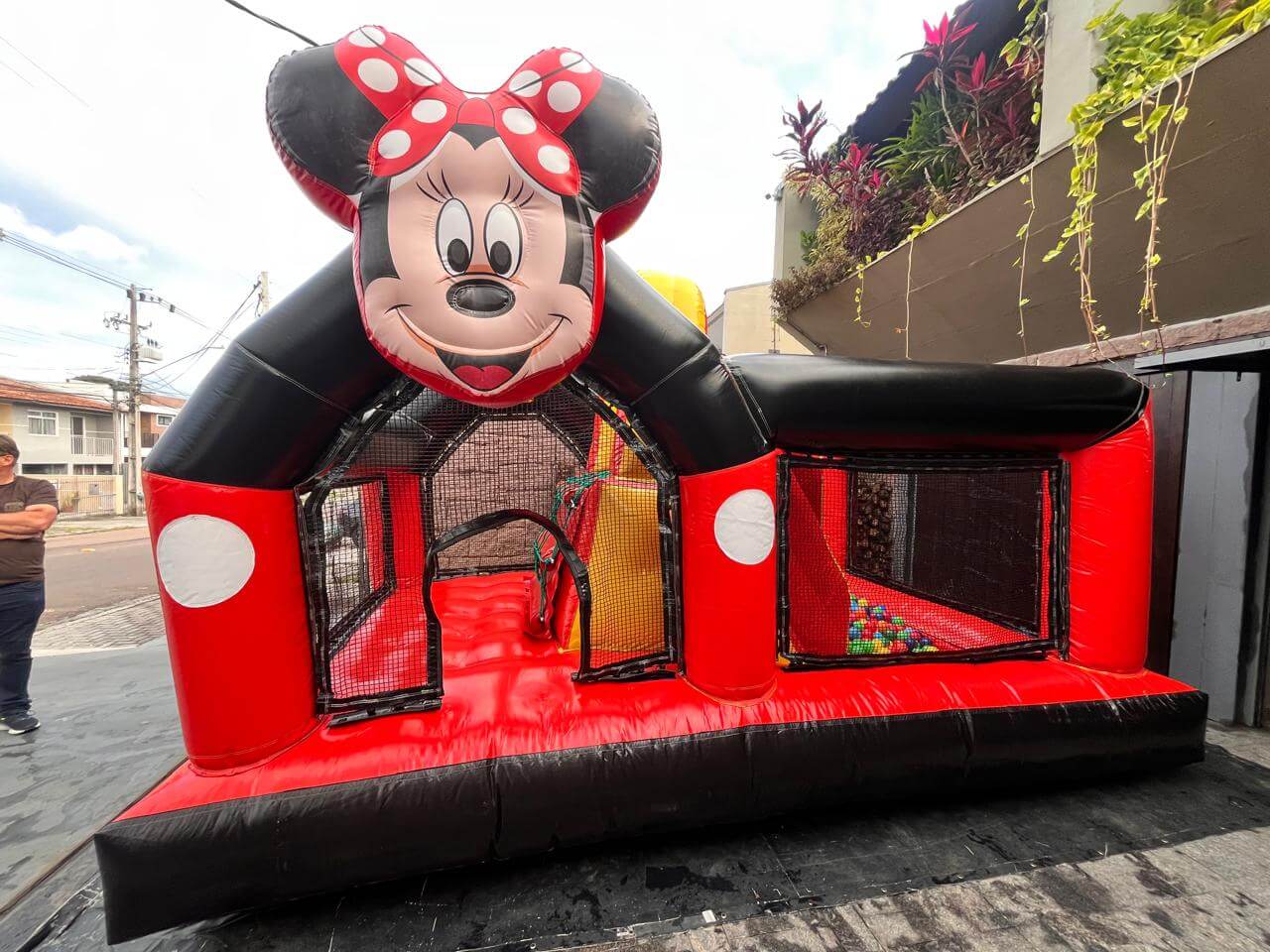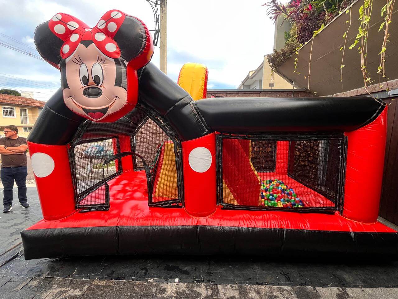 Um inflável temático da Minnie que reúne 4 atrações em 1 só brinquedo: pula-pula, escalada, escorregador e piscina de bolinhas. Diversão completa que transforma qualquer festa em um verdadeiro parque para a criançada!